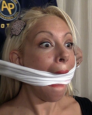 Busty blond roughly tied up and gagged with panties