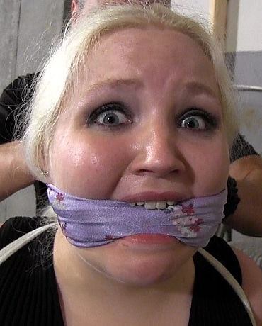 Michelle(Vicious Vamp) and her partner in crime have captured this man. While Michelle keeps an eye on him handcuffed to the door, her partner goes off to rip him off by using his bank card. At one point, Michelle, needs to use the ladies room. Thinking the man is secured, she leaves him. But this man came prepared and comes out with a handcuff key. He frees himself and waits for Michelle to return. Michelle is shocked to see the man has escaped. But there is nothing she can do as he over powers her and ties her up with rope. He then makes her get on her knees so he can her to suck on a metal pipe to humiliate her. When he is done, he stuffs her mouth with panties and then ties another pair of panties between her teeth to gag her. He then leaves her struggling bound and gagged on the floor as he waits for her partner to return. After a while, the man gets tired of waiting. He is also not satisfied that Michelle is secured or quiet enough. So he pulls off her skirt and hogties her. He also gags her with an additional pair of panties and covers her head and face with a nylon stocking. He wraps tape around her face and over her mouth to make sure the gag stays well secured and keeps her muffled. And finally to make it very humiliating when her partner comes back to find her like this, he pulls her great big tits out of her bra.