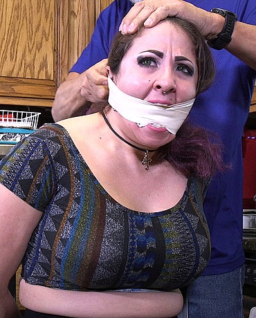 Some man is in Gia's house and he has her tied up in the kitchen. Gia notices outside that the UPS delivery man has pulled up in front of her house to deliver packages that she has been waiting for. She struggles anxiously hoping he will hurry and come to her door so she can scream for help. But then the bad guy comes in and sees the delivery truck outside. To make sure Gia cannot cry out for help, he stuffs and tapes her mouth to gag her. Moments later, there is someone at the door. Gia grunts and whimpers through the gag trying to make sounds as the bad guy answers and sign for her packages. The delivery man then leaves without noticing anything wrong going on in Gia's house. Later she is put on the and tied more secure. After pulling Gia's big tits out of her bra, the bad guy decides to have some real fun with his curvy captive. He then leaves her with her panties down as he makes his get away.