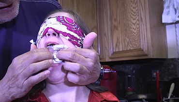 Someone has come into Rachel's home. He has her blindfolded and tied down to a chair. When Rachel starts making too much noise, the man stuffs her mouth and ties a rag between her teeth gag her. Rachel is left to struggle on the chair. Some how she gets the blindfold off. But she cannot not get herself untied. Later, she has struggled so hard, the chair has fallen over. Now on the floor, all Rachel can do is wait for someone to rescue her. Suddenly, she hears someone at the door. She screams through the gag, but no one can hear her. Hopefully the person will go around to the back down and find it left open by the bad guy when he made his escape.