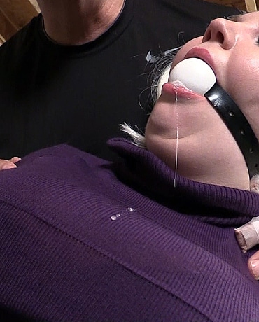 When Michelle saw him bring out rope, she got somewhat excited and asked him how he knew she was into bondage. But then told him that she didn't allow anyone to tie her up on the first date. But as he tied her hands behind her back, Michelle had no ability to resist. She tried to protest when the man strapped a big white ball in her mouth. The next thing she knew she was gagged and getting tied with more rope. Sometime later, Michelle found herself struggling bound and ball gagged. Later the man came back and removed the ball gag. But then he immediately stuffed her mouth and then wrapped her face with tape. Then he untied her hands, but only long enough to take off her dress. He then re-tied her. This time tighter and with a lot more rope. Now Michelle was completely bound and gagged in her bra, garters, stocking and panties. But soon the bra came down and not she was bouncing her big tits about as she struggled on the floor hogtied and gagged. She was also very turned on and ready to get her panties pulled down