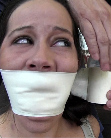Summer is home alone, sitting on her deck. She doesn't hear him, but a man sneaks up on her and grabs her from behind. After he over powers her, he drags her inside and into her living room. There he uses speaker wire to tie her up. To make sure she stays somewhat quiet, he ties a gag between her teeth. A short time later, Summer figures out what is going on and starts to put up a struggle. This causes the man to use more speaker wire until her has her completely trussed up and unable to cause him any problem. Realizing the first gag is no going to shut her up enough, the man stuffs her mouth with two pair of panties and then tapes her up to gag her again. Finally, he makes sure Summer stays secured in the living room by using more speaker wire to hogtie her. With her dress top down and her dress hem all the way up her hips, Summer struggles bound and gagged. But because she is tied so tight with the thin speaker wire, every movement is very painful.