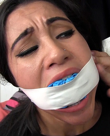 Believing no one would be home, he broke into the place looking for a top secret video tape. All of a sudden, he heard a noise and immediately hid in the closet. He then saw Sahrye walk in and realized she was there looking for the same thing. He watched her search and when she found the tape, he knew he had to do something. So without her aware of presence, he grabbed her from behind. Knowing he needed to restrain her, he wished he had brought some rope. But then he found speaker wired and tied her up with it. Then to shut her up, he stuffed her mouth with a huge pair of panties. He then wrapped tape around her face to finish gagging her and now the sexy cat burglar was totally helpless and at his mercy. Sahrye knew she could not let this guy leave with the tape she desperately needed. But she was tied very tight and the wire cut into her skin with every little movement she made. But the worse part for now was the gag. The panties must have belonged to the woman of the house and judging from the size of them (XXXL), she was obviously a very Big Woman. They were packed in so tight, her jaw hurt and she was very near to choking on them. But things were about to get worse, when the man brought out more wire and put Sahrye into a strict hogtie. He also tied wire up her crotch so anytime she kicked her legs, the wire went up deeper inside her. Things were going to be getting very embarrassing if she could not get herself loose. It would be hard to explain what she was doing bound and gagged in their place when the homeowners returned home to find her.