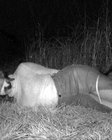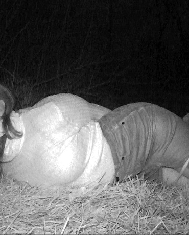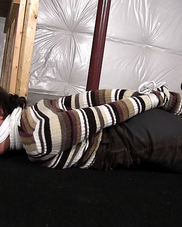 He is trying to get away from these people who are after him and he has their girl Sahrye with him as a hostage. Her hands are tied behind her back, she is gagged and being led by a piece of rope tied around her neck. It is cold and dark outside and he has to find a place to hide out for the night. He sees a house in the distance and decides to check it out. He breaks in and finds the place empty. The video begins with him throwing Sahrye down on the floor of a basement. He hogties her and leaves her to go look for something better to tie her up with. When he returns, he has pantyhose and some torn up bed sheets which he uses to tie Sahrye up very tight with. But before he does that, the man strips Sahrye down to her bra, panties and pantyhose. He then re-gags her by stuffing her mouth with a pair of pantyhose and then taping her up. By the time he is through with her, the man has Sahrye hogtied and with a piece of torn bed sheet tied tight up her crotch. Sahrye is again left alone to struggle bound and gagged. This time for the rest of the evening. She will do her best to get loose and make as much noise she can with hopes, her friends will find her. But even if they walk right by this house, no one will ever hear her or know she is here.