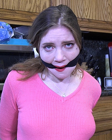 Misty notices there is someone at her neighbor's house. But her neighbor is out of town, so she goes to investigate. It is a burglar and Misty soon finds herself all tied up and gagged. As the bad guy ties her, he notices that Misty is not wearing panties. This is something he will take advantage of later. While he is at it, he might as well pull her tits out too.