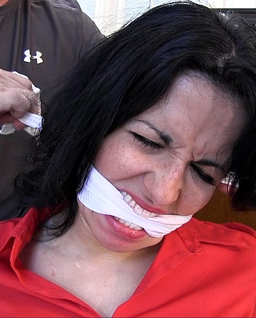 Secretary tied up behind her desk with a sock stuffed in her mouth