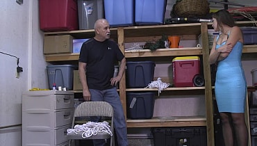 The video begins with the man taking Rachel into his garage. He has already shown her the inside of the house. As she looks around, the man cannot help but notice that Rachel is dressed way to sexy for a housewife just going next door to check on a problem. She is wearing a dress that is so tight, he can see the impression of garters holding up her stocking under. She is also wearing high heels. At one point, Rachel notices that the man has rope. Lots of it. "What do you use this for?" she asks as she hold up some of the rope. "None of your business!" he tells her. But she insists on asking and expects an answer. So he tells her that he uses it to tie up snooping neighbors. He then grabs her and pulls her arms behind her. "You wouldn't dare!" Rachel tells him, but hardly puts up a fight. "Maybe I'll tie you up!" the man replies. "Oh really. I dare you!" The man realizes that Rachel came to his place dressed the way she was because she wanted to play. He knew her husband hardly paid much attention to her and most likely didn't satisfy her in the bedroom. So a short later, Rachel found herself all tied up in the man's garage. Having an interest in bondage, Rachel wants to carry this further and knowing the outcome of her next remark, she threatens to scream for help. As she expected, the man stuffs and ties a gag in her mouth and now Rachel is very turned on. The man grabs her by her throat and makes her admit to him that she came over because she wants to play. Rachel gives in and nods her head "Yes" as she also tries to tel him through the gag. So the man uses more rope until her has her completely tied up. Later he returns to her with a roll of tape. He tells her that when he bends her over and uses her as his captive sex toy, he doesn't want anyone to her her loud moans. Rachel even more excited now, couldn't agree more. The man wraps the tape over her already packed and gagged mouth. He then lifts her dress and crotch ropes her. After pulling her boobs out of the dress, he hogties her on the floor and leaves her to struggle bound and gagged. As she squirms around, Rachel cannot help but notice what the rope pushing her skimpy thong panties up inside her is doing to her. That along with the thought of what the man is going to do to her causes her to lose it and have a bound orgasm. Then later, the man returns and Rachel can hardly control herself. He tells her that first, he would like to use her mouth. The man cannot get the tape and gag out of her most fast enough for Rachel. And when it is off, she opens her mouth wide as she sees him start to unzip his pants.
