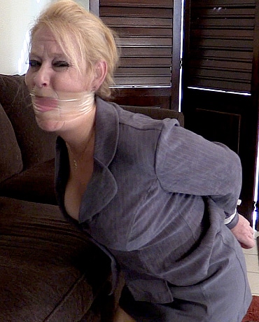 Their teacher, Ms Dark has some photos of them doing some very naughty things. Before Ms Dark can show these photos to anyone, they need to get the photos. So they sneak into Kristyna's place when they think she is not home. The video begins when they are caught and Ms Dark tells them all the trouble they are in. But then they grab her and tie Kristyna up with rope. To keep her quiet while they look for the photos, they stuff and tape a gag in her mouth. They then leave Kristyna to struggle bound and gagged in her living room. Finally after they find the photos, they leave. But not before pulling Kristyna's bra down so her big tits can bound about as she struggles to get loose.