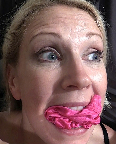Missey is an English woman on vacation across the Atlantic. Unfortunately, the person who was suppose to pick her up at the airport didn't show up on time and she took a ride from some man claiming to be her ride. The video begins with this man taking her into a hotel room and making her sit down. With Missey protesting in her thick British accent, the man ties her up with rope. Then to keep her quiet, he stuffs and ties a gag in her mouth. Left alone, Missey struggles hard to get loose. "Who is this man and what does he want with me!" she asks herself. "How did I fall for his line and get into his car! Now look at me all tied up with a pair of panties stuffed in my mouth!" But things are only going to get worse as the man returns and bends her over so he can pull off her skirt. Then he puts her on her knees so he can pull open her blouse and pull her bra down. Finally the man hogties Missey and leaves her again. "Good gosh! Look at me now! My tits are out and he can see my panties under my pantyhose!" Missey mumbles to herself.