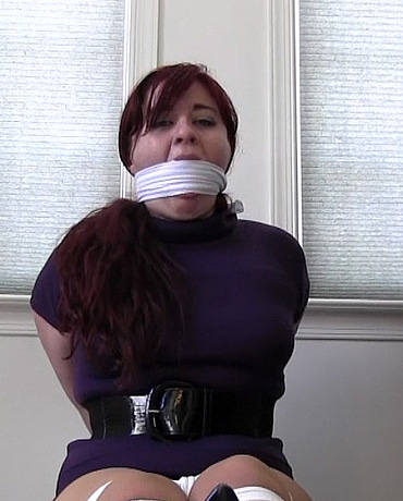 When the phone rings, no one answers. That is because Sonya, the office manager is bound gagged and tucked away on the other side of her desk. She struggles to get loose, but the rope is tied tight. A short time later, the bad guy returns to her and removes the gag. He gives her two choices, "Give me the password to your computer or your panties are coming down". Instead of begging and pleading, Sonya surprises the man when she smiles and asks him if she can have both. Give him the password and still have her panties pulled down so he can do naughty things to her. She tells him that being tied up like this really has her turned on. Unable to pass up a opportunity like this. he re gags her by stuffing her mouth and taping her up and agrees to her idea. A short time later, after getting what he came for, the man returns to Sonya. As he lays her face down on the floor and pulls her pantyhose and panties down, she can hardly control herself. A few hours later, the cleaning crew will come in and find Sonya still struggling bound and gagged with her panties down.