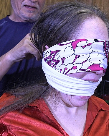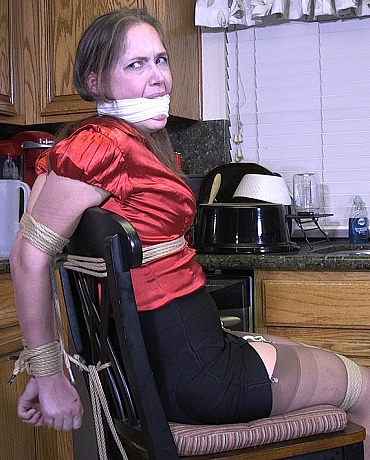 Someone has come into Rachel's home. He has her blindfolded and tied down to a chair. When Rachel starts making too much noise, the man stuffs her mouth and ties a rag between her teeth gag her. Rachel is left to struggle on the chair. Some how she gets the blindfold off. But she cannot not get herself untied. Later, she has struggled so hard, the chair has fallen over. Now on the floor, all Rachel can do is wait for someone to rescue her. Suddenly, she hears someone at the door. She screams through the gag, but no one can hear her. Hopefully the person will go around to the back down and find it left open by the bad guy when he made his escape.