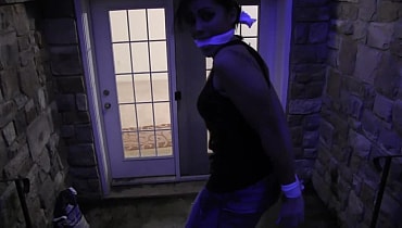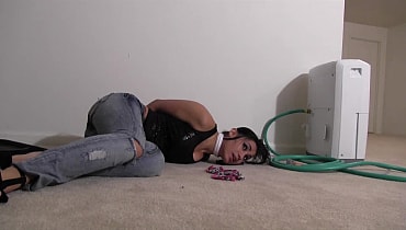 The video begins with Sahrye finding a house and trying to get someone to help her. But no one is home. However, she finds an open door and she goes inside to hide. She is able to get the gag out of her mouth and she tries to use her cell phone to call for help. Unfortunately, the man has tracked her down and re-captures her. He re gags her and drags her to a basement room in the house. There is ties her in a very tight hogtie so he can check the place out. When he is sure it is safe(For him), He brings out more rope to finish tying Sahrye up. This time he is going to make sure, she doesn't get away. Once he has her completely trussed up and very helpless, he makes sure, she can not get the gag out again. This time he stuffs her mouth with huge pair of panties he found upstairs and then he wraps her face very tightly with medical tape. He wraps so tight between her teeth, that Sahrye is sure she will XXXX on the panties if he wraps it any tighter. After he puts Sahrye in a very strict hogtie with a crotch rope, he leaves to struggle bound and gagged with her tight jeans down to her thighs. But there really isn't any sense in struggling too hard. Because tied and gagged so painfully tight, there really is no hope of escape this time. Then take a turn for the bad for the bad guy as the home owners return. He has to make a hasty get away. He returns to Sahrye and lifts her, still hogtied, over his should and carries her off.