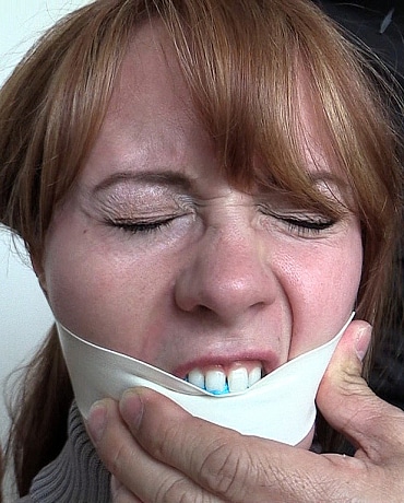 Madalynn comes to his place because he owes her some money. When he is a few "Cents" short, she makes him dig into his pockets for the change. She sees that he has a pair of women's panties in one of the pockets and starts to ridicule him. "What do you use those panties for!" she demands to know and accuses him of being some kind of freak. She persists and after a while, he gets tired of her questioning and decides to show her exactly why he has a pair of his girl friend's panties in his pocket. He shows her that in another pocket he has some rope and grabs her. Using the rope and more that he has near by, he ties her up good and tight. Then with Madalynn protesting, he wads up the panties and stuffs them in her mouth. Using tape, he wraps them in good and tight to gag her. The panties taste horrible and Madalynn comes close to choking because they are packed in so tight. But all she can do is grunt and whimper as the man adds more rope until he has her hogtied with hundreds of feet of rope. "How do my girls friend's dirty panties taste" he tells her as he walks away to leave her struggling bound and gagged.